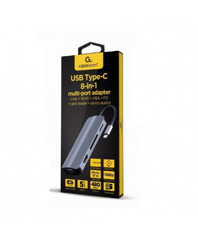 Adapter USB-C 8w1, HDMI, USB-C, PD, VGA, USB 3.1, 2.0, audio, czytnik kart